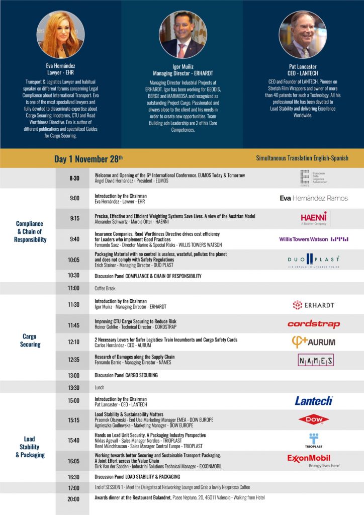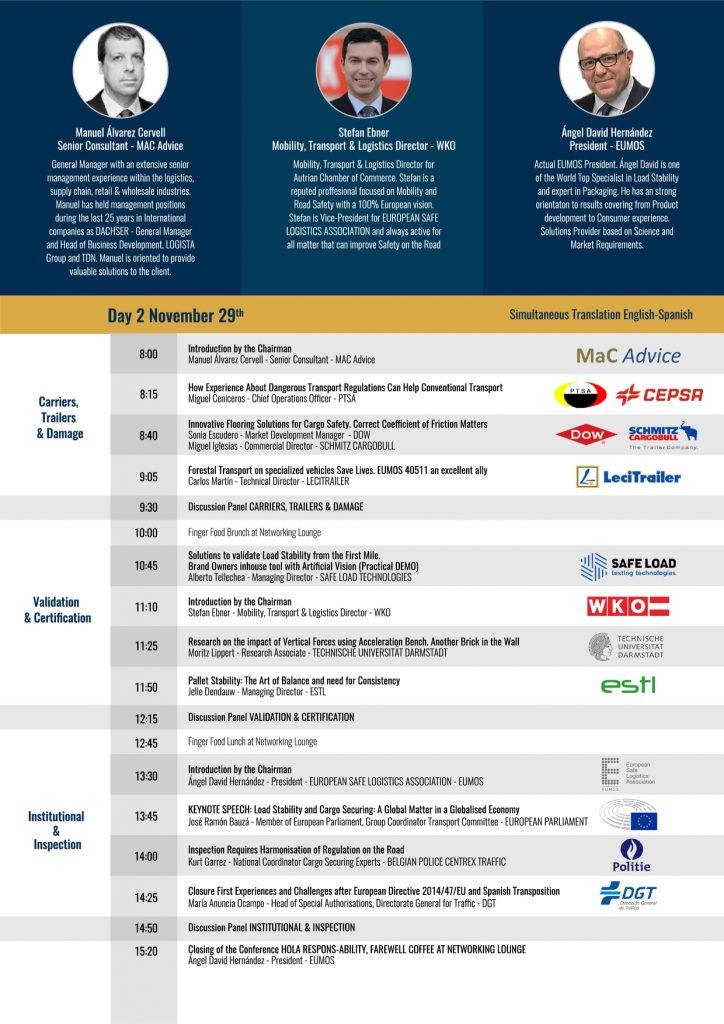 Senior experts in cargo securing and load stability meet in Valencia during two days on 28-29 November in order to discuss – under the title “Hola Respons-ability – Chain of responsibility´s ability to create best practices in Europe” – the latest research and practices aiming to make the road a safer place. Angel Hernandez, President of EUMOS, says “Logistics in Europe have developed far in the course of the last 10 years and EUMOS is growing both in numbers of members as well as in the broadness of its perspective. This conference will deal with one important aspect industry has asked clarification for: the chain of responsibility in logistics.” EUMOS, the leading stakeholder on load stability, is fully committed to the EU Vision 0 aiming at eliminating fatalities on the road by 2050 and will ensure to play its part in getting closer to the objective.