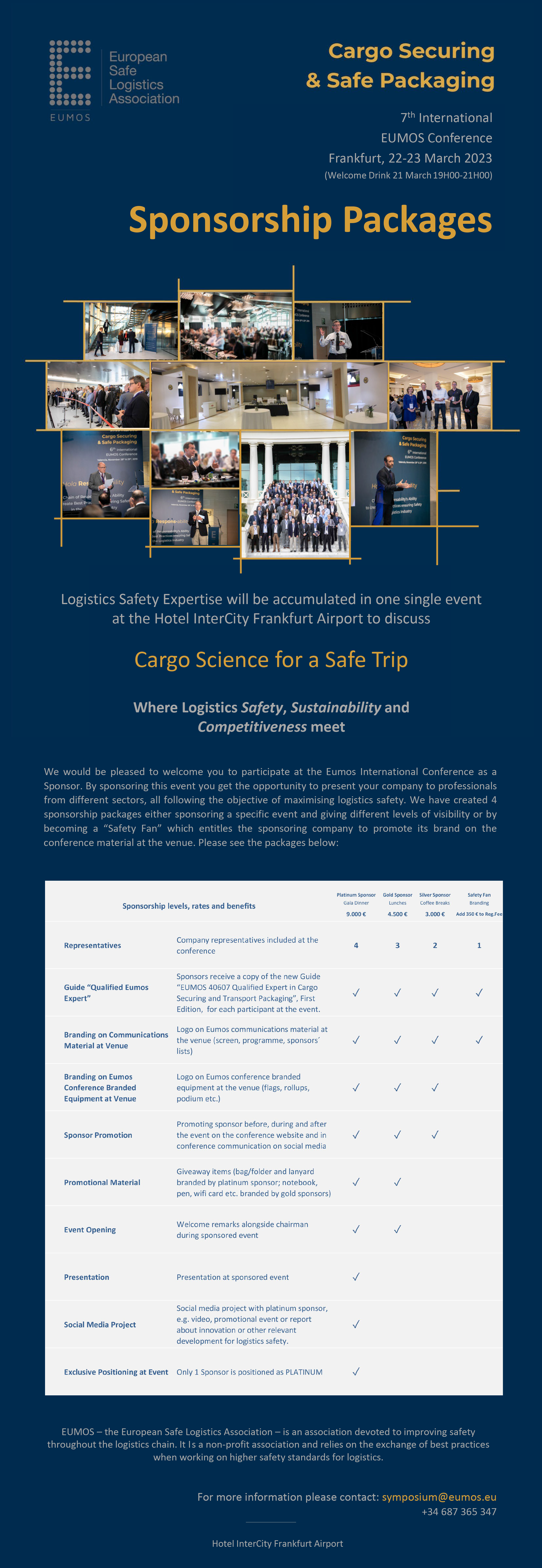 We would be pleased to welcome you to participate at the Eumos International Conference as a Sponsor. We have established 4 Sponsorship Categories giving different levels of visibility at the event. Please secure your sponsorship by writing to us under symposium@intern.eumos.eu or by calling us under +34687365347. See the sponsorship packages below: